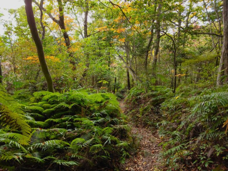 鳴谷池に向けて降下していくトレイル。シダ植物に覆われて、少し紅葉も始まって、なかなか雰囲気の良い状態だ。