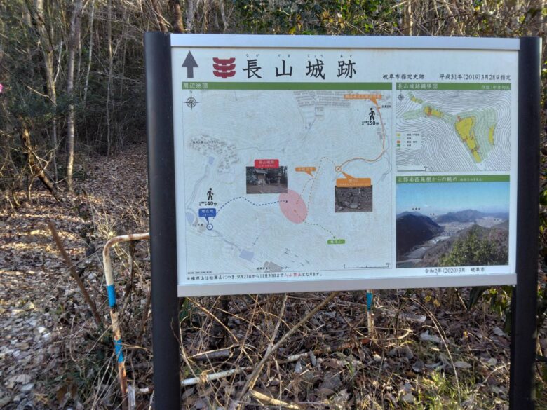 リフレ芥見側の登山口には長山城跡についての看板がある。そこから尾根筋に沿って登山開始である。
