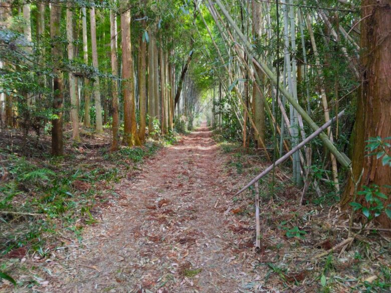 ため池の所の林道を右折し、竹林を少し行くと、北山へ向けて登るトレイル(やはり、高圧電線の管理整備道)が左側に現れる。