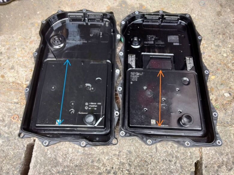 従来の輸入車のオイルパンは右側。今回さきもりちゃんから取り外したオイルパンが左側。この新しいタイプのオイルパンを装着した車のATF交換は初めてとのこと。ATを覆う部分が古いタイプ(橙)に比べて新しいヤツ(青)は長くなっている。