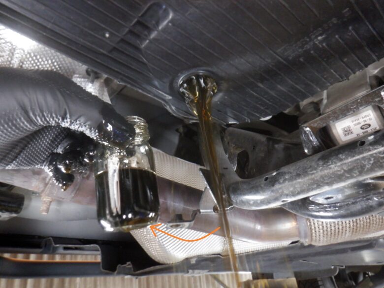 使い古されたATFを抜いていく。この古いATFの一部をビーカーに入れて保存し、交換後のATFと比較する。4.5ℓのATFがしっかり抜けきったことを確認する。
