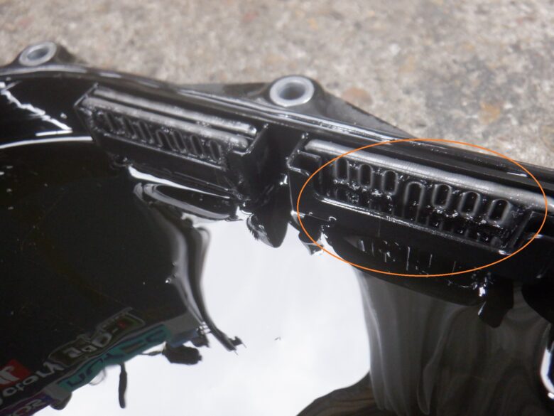 従来のオイルパンでは、ゴムパッキン部分(橙色矢印)が薄く、ボルトのしめ方がヘタクソだとオイル漏れしたらしい。それに比べて、新しいタイプのパッキン(青矢印)は太くなり改善されていることがわかる。