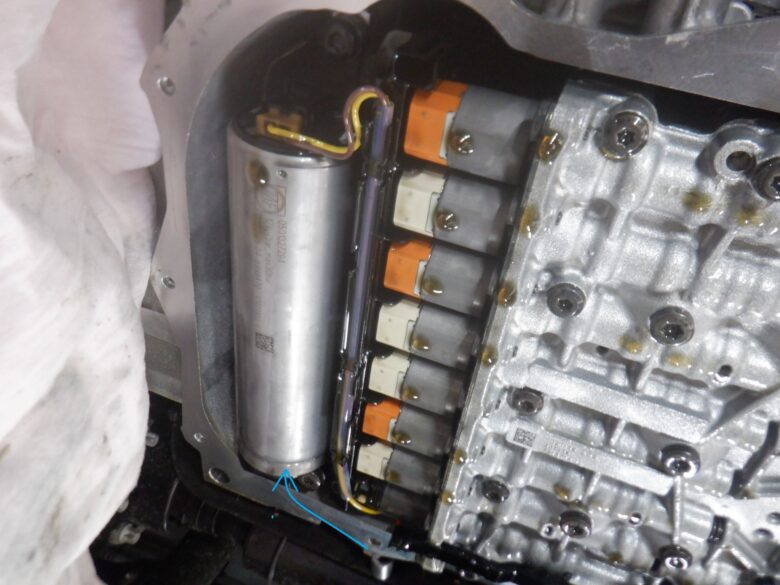 オイルパンを取り外すと、バルブボディーが露わになる。左側のオレンジ矢印がアイドリングストップ機構関係のシリンダー型の部品?で、ここも汚れが少しあるようだ。その隣の、黄色矢印部分は8流路あるので、ギヤごとのATFが流れる流路?。