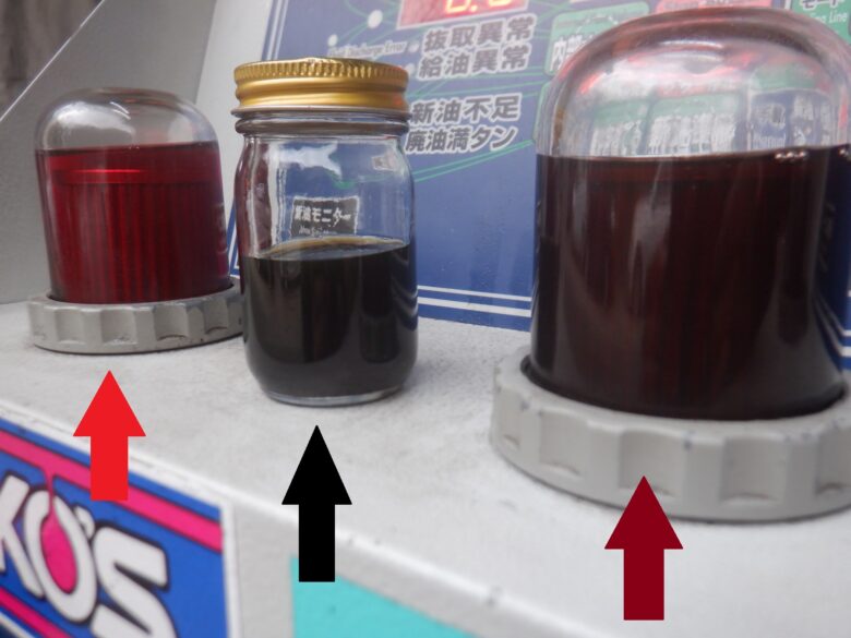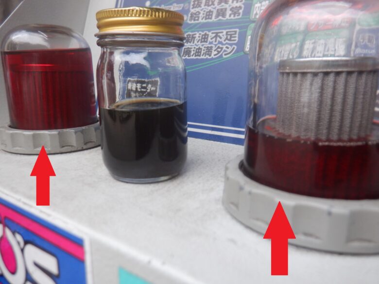 圧送交換終盤の状態。左の赤矢印のところが新油。真ん中の瓶が使い古しの油(さきもり号に入っていた油)。そして、右側の赤矢印がさきもり号のATに満たされている油なのだが、ここまで来ると、左(新油)と右(注入した油)のフルードはほぼ同じ状態となった。これがトルコン太郎による圧送交換の威力なのである。今回の『Royal Purple Max ATF』というATFは高温域に極めて高い耐性があるので、日本の夏場では威力を発揮するらしい。夏が来るのが楽しみだ。