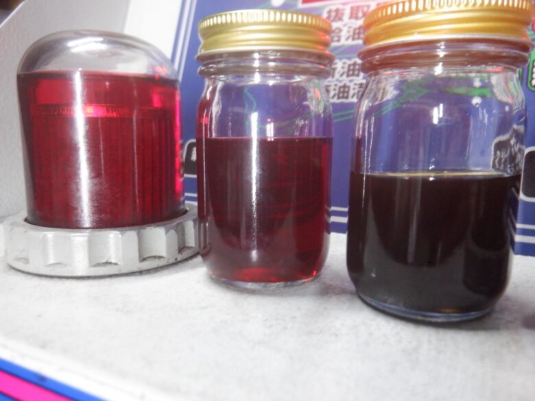 左側が新油。カプセル内に銀色の異物除去用のフィルターがあるため、それによる光の反射のため、かなり明るい赤色になっていることに注意。現実はもっと暗い赤である。右側が、何度も登場しているが、交換前のさきもり号のAT内に充満していたATFであり、真っ黒だ。そして、真ん中が先ほどのオイルレベル調整でAT内から流れ落ちてきた油。きれいな赤色で、圧送交換が完璧に行われたことを実感できる。さーて、後はドライブ中の変化を実感できるかな。